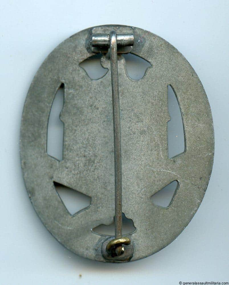 General assault badge – Frank & Reif, Stuttgart. Mid to late war unmarked solid zinc GAB with F&R design. Remains in lightly worn condition with some of the finish worn down. Good quality GAB.