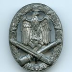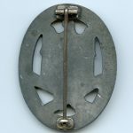 General assault badge- Frank & Reif Stuttgart. Heavy solid zink badge with soldered on catch and sheet hinge. Unmarked variant of the known Frank & Reif GAB. Some silver chrome finish remaining and the badge holds a bright look to it. F&R made very heavy and good quality GAB. More uncommon GAB maker without damage or repairs.