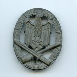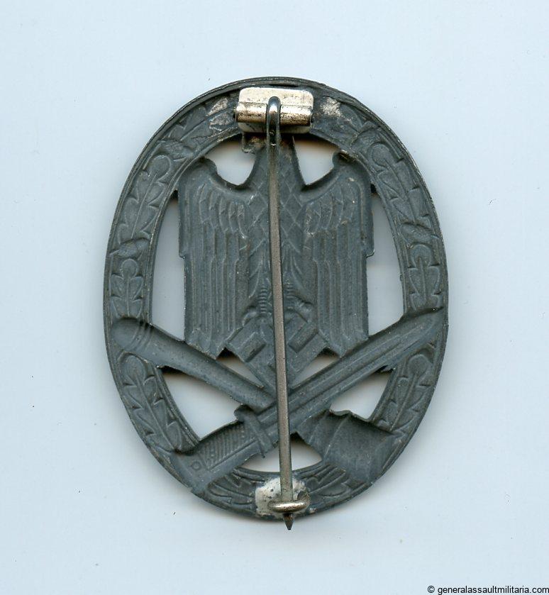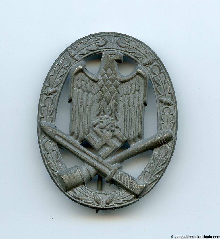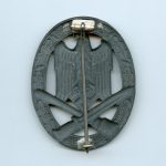 General assault badge – Franke & Co Lüdenscheid. Hollow zink construction with slight signs of wear and light curve. The silver finishes has completely faded on the zink base material. This is normal with FCL badges that had the white frosted finish applied. Textbook FCL without damage or repairs.