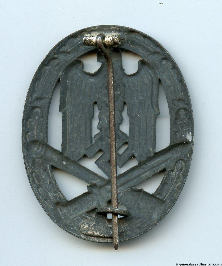 General assault badge – Gebrüder Wegerhoff, Lüdenscheid. Mid war hollow zinc construction with tombac sheet hinge and zinc GWL catch. Remains in good unworn condition with the fragile silver was finish faded into dark grey. Sought after variant with all parts cut out.