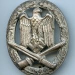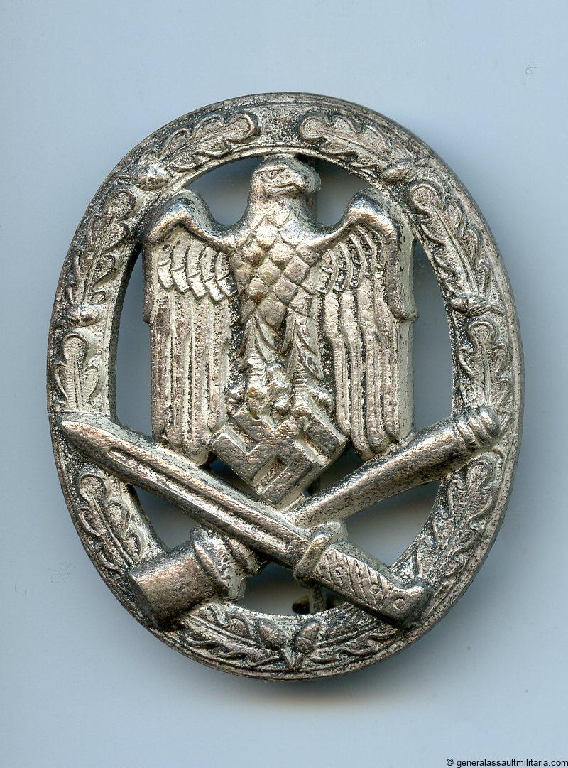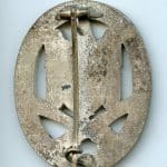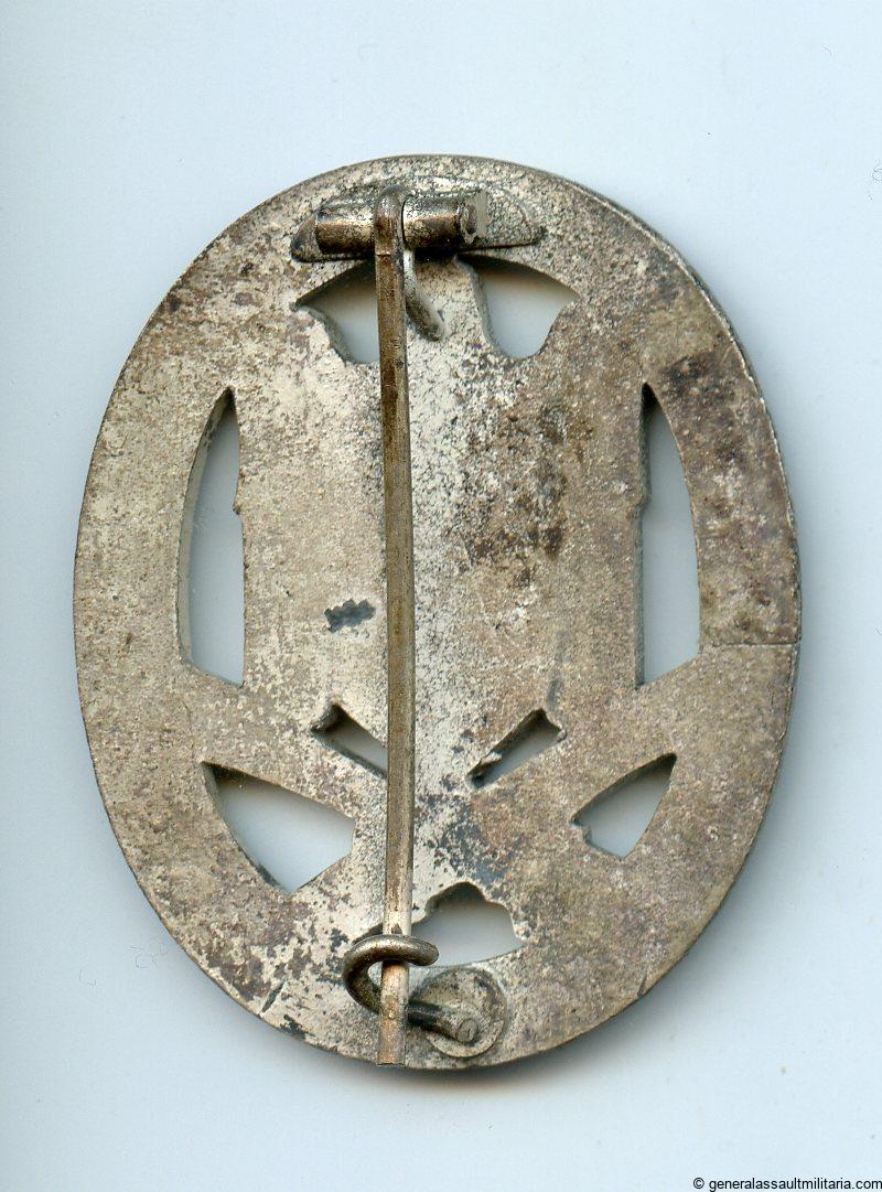 General assault badge – ‘Half moon’. Heavy zinc GAB with unique design and hinge plate referred to as the ‘Half moon hinge variant’. Remains in unworn condition and has all the silver finish present with a tombac coating underneath. Shows only a light patina on some areas.