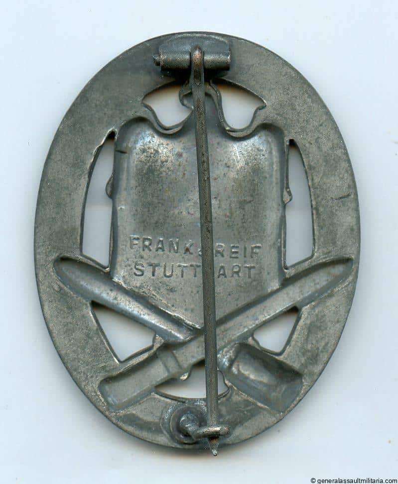 General assault badge in silver – Frank & Reif, Stuttgart. Mid to late war semi-hollow GAB with Frank & Reif Suttgart makers mark on the back. Nicely worn ‘Glanzverzinkt’ example with factory polished front. Remains in very nicely worn condition, with some of the finish worn down or patinated. Bit more uncommon and sought after GAB with full makers mark.