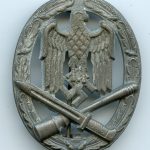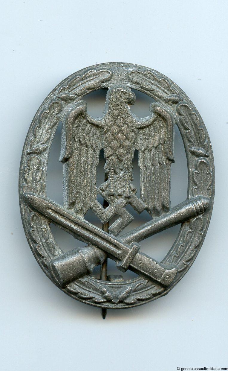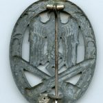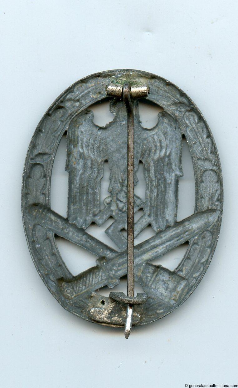 General assault badge in silver – Gebrüder Wegerhoff, Lüdenscheid. Early to mid war hollow zinc badge with cut out GWL design and typical zinc GWL catch. Rmeains in unwonrn condition but has its finish faded over time. Typically encountered with out finish and light surface oxidation as is the case here. Sought after and good looking GAB design.