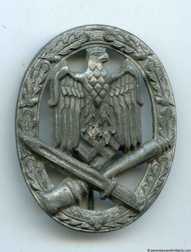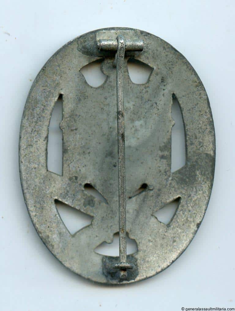 General assault badge – Karl Wurster, Markneukirchen. Mid to late war solid zinc ‘Allegemeines Sturmabzeichen’ with silver chrome like ‘Burn lacquer’ and small W makers mark next to the hinge. Remains in lightly worn condition with some damage to the front talons and nearly all the finish remaining. Nicely preserved and marked GAB, with the variant sheet hinge setup.