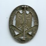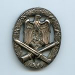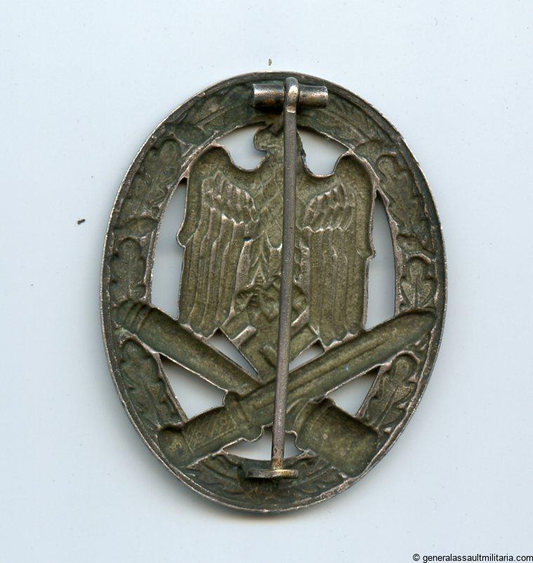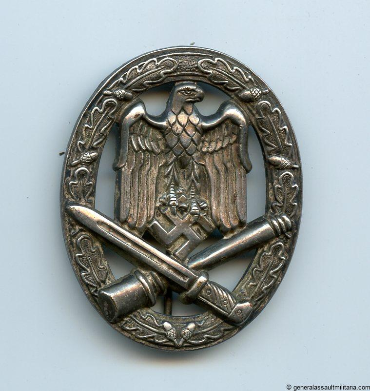 General assault badge – Otto. Schickle, Pforzheim. Hollow tombac badge with typical schickle design and setup. Well worn badge with good silver plating. Early war piece with a good worn look to it. No damage or repairs.