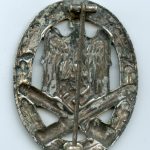 General assault badge – Petz & Lorenz, Unterreichenbach. Early hollow tombac GAB with Petz Lorenz design. Remains in nicly worn condition and has most the silver plating still present. The back of the badge shows some surface oxidation and has the setup repaired. Pin and catch are not original to this badge indicating the appearance on the back was to aged to make it appear better. Nevertheless a rare early assault badge normally priced way higher.