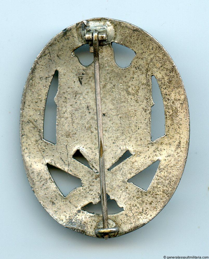 General assault badge – Rudolf Karneth, Gablonz. Mid to late war semi hollow zinc GAB with crimped block hinge setup and catch. Remains in lightly worn condition with good quality thick plated finish. Very well preserved GAB.