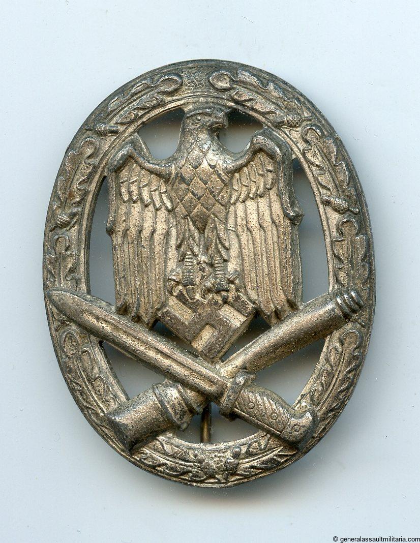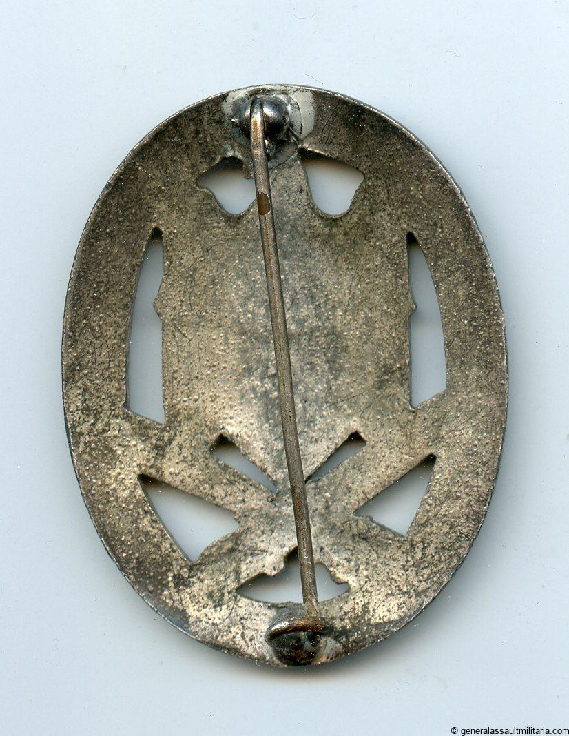 General assault badge – Rudolf Karneth, Gablonz. Mid to late war zinc badge with crimped in ball hinge and catch. Remains in only lightly worn condition and has retained the finish well on the front and back. Very well preserved RK GAB with variant silver finish.