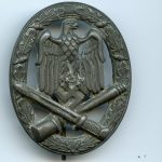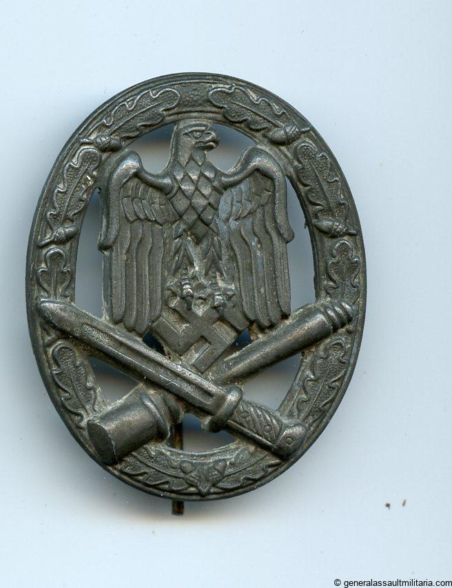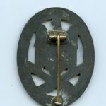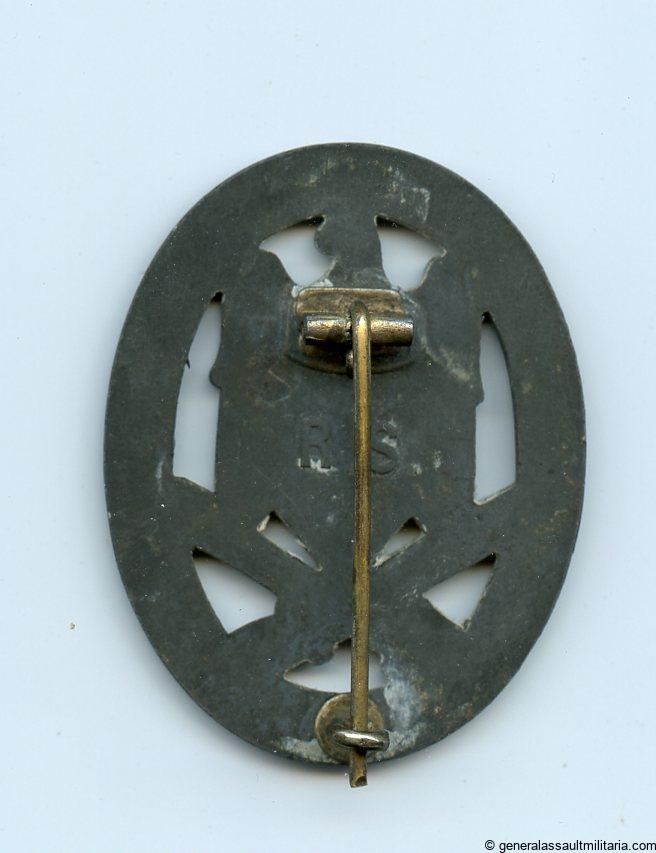 General assault badge – Rudolf Souval, Wien. Well worn general assault badge that lost all its finish and is often encountered in this condition. Marked with the thick maker logo of RS on the back, short setup with the round wire catch and blase plate. Well worn and more common GAB without damage or repairs.