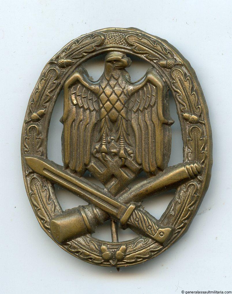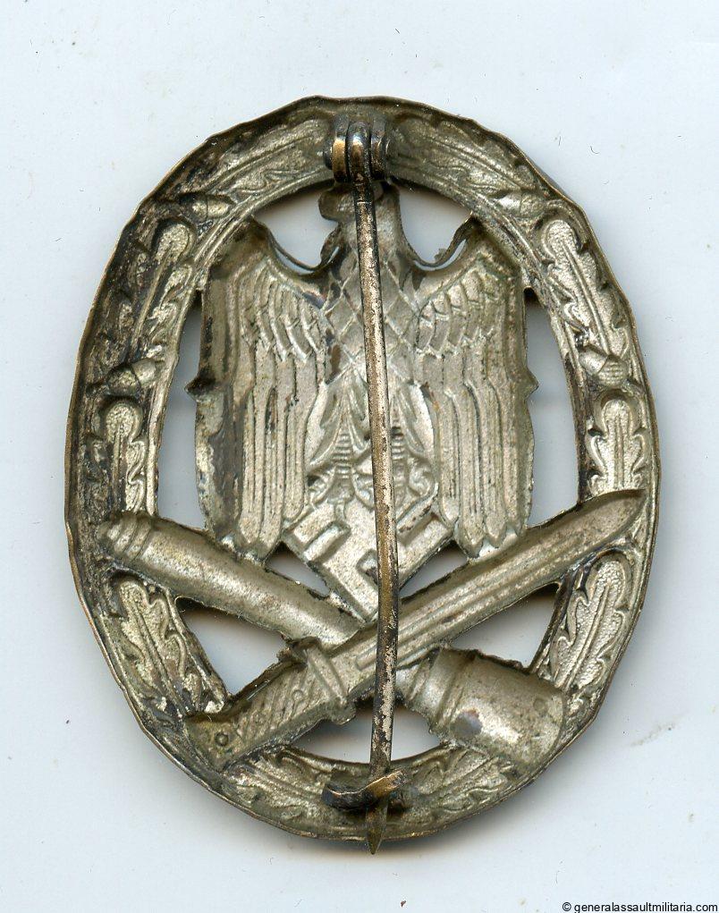 General assault badge – Steinhauer & Lück, Lüdenscheid. Early war hollow tombac S&L design ‘Allgemeines Sturmabzeichen’ with typical S&L setup. Remains in heavily worn condition with nearly all the finish worn down on the front and only traces remaining. Slightly bend forward on the top and bottom, but has retained its sharp detail. Very rare GAB that is almost always found in well worn condition.
