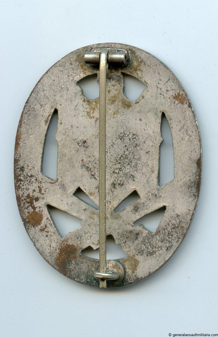 General assault badge – Unknown ”cupal maker”. Mid war cupal badge by a still unknown maker. Remains in nicely worn condition and has a good part of the silver finish still present on the front and back. Still looks bright and has developed only little patina on the back. The only solid cupal GAB variant.