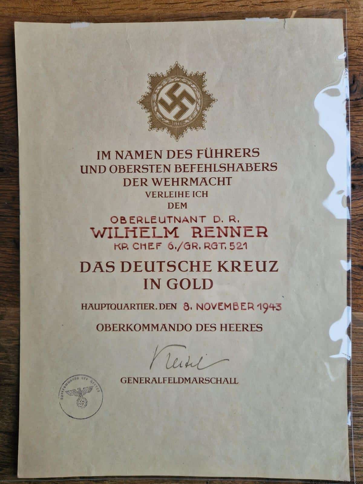 German cross in gold award certificate – Wilhelm Renner Chef. 6./Gr.Rgt 521