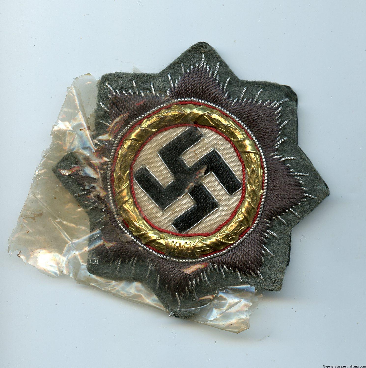 German cross in gold – cloth Heer variant. Cloth version of the ‘Deutsches Kreuz in Gold’ with cupal gilded wreath and bullion stichting. Remains in excellent condition and comes with part of the very fragile cellophane packing. Killer example on green army cloth and with black paper backing.