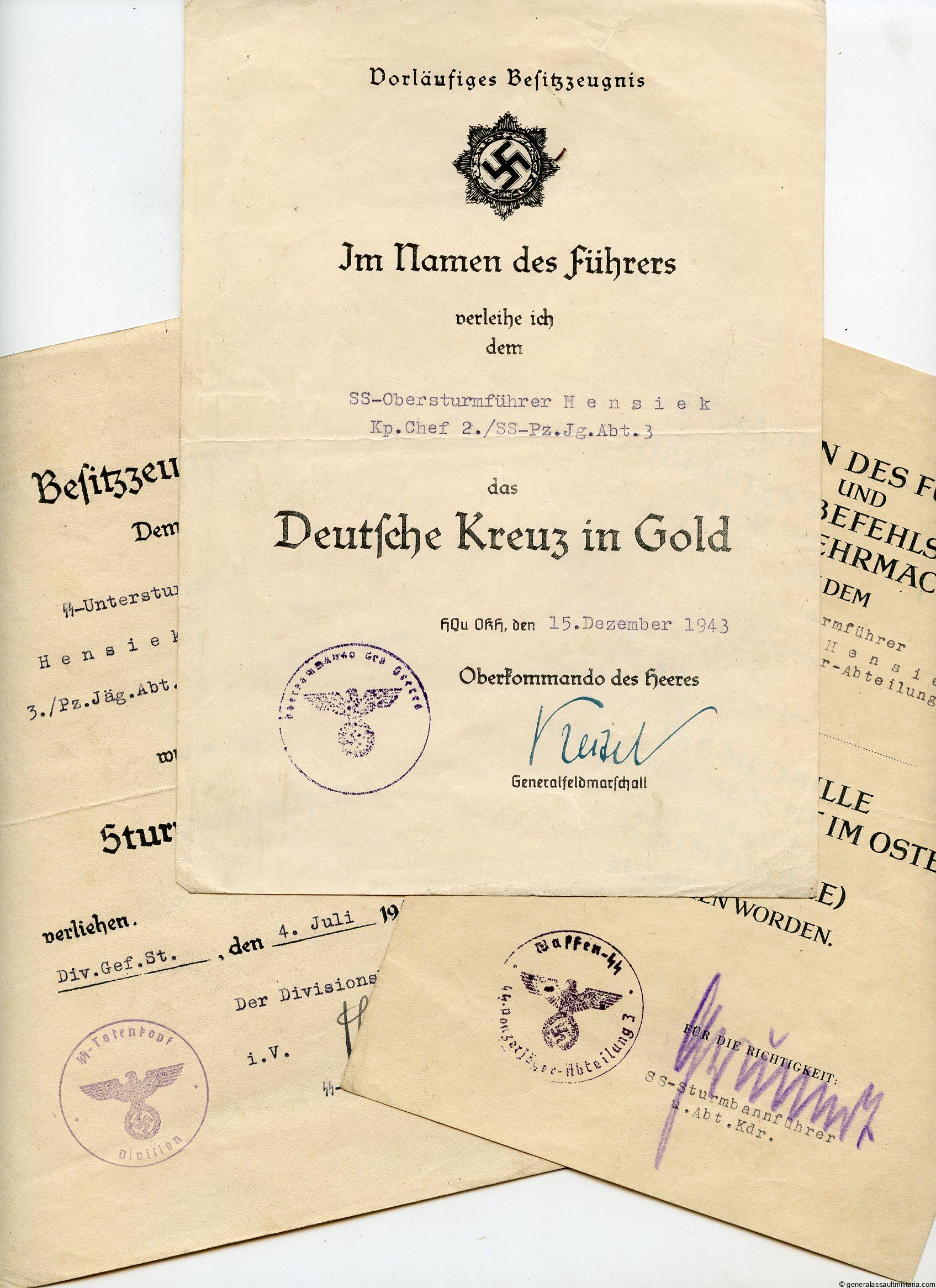 German cross in gold set to SS-Obersturmführer Hensiek Kp. Chef 2./SS-Pz.Jg.Abt