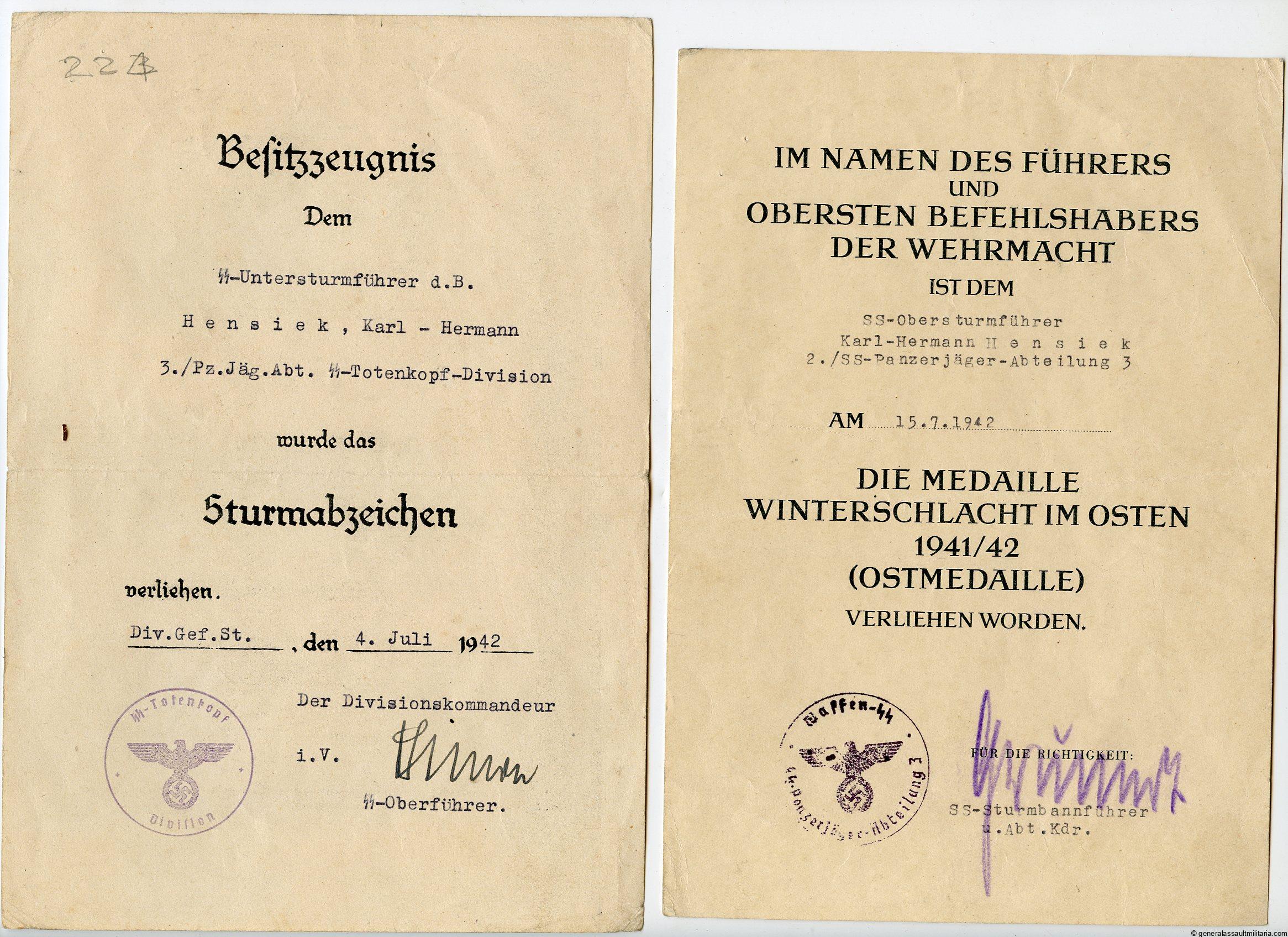 German cross in gold set to SS-Obersturmführer Hensiek Kp. Chef 2./SS-Pz.Jg.Abt. 3 Totenkopf. Very rare and special document set consisting of Hensiek his DKIG document with Keitel facsimile awarded 15.12.43. General assault badge award certificate singed by Max Simon, Ost medal singed by an Oberstürmbannführer. Hensiek last rank was Hauptsturmführer and he was a member of the SS since 1934, he was also decorated with the CCC in silver and fought in France, Russia and later the Netherlands.