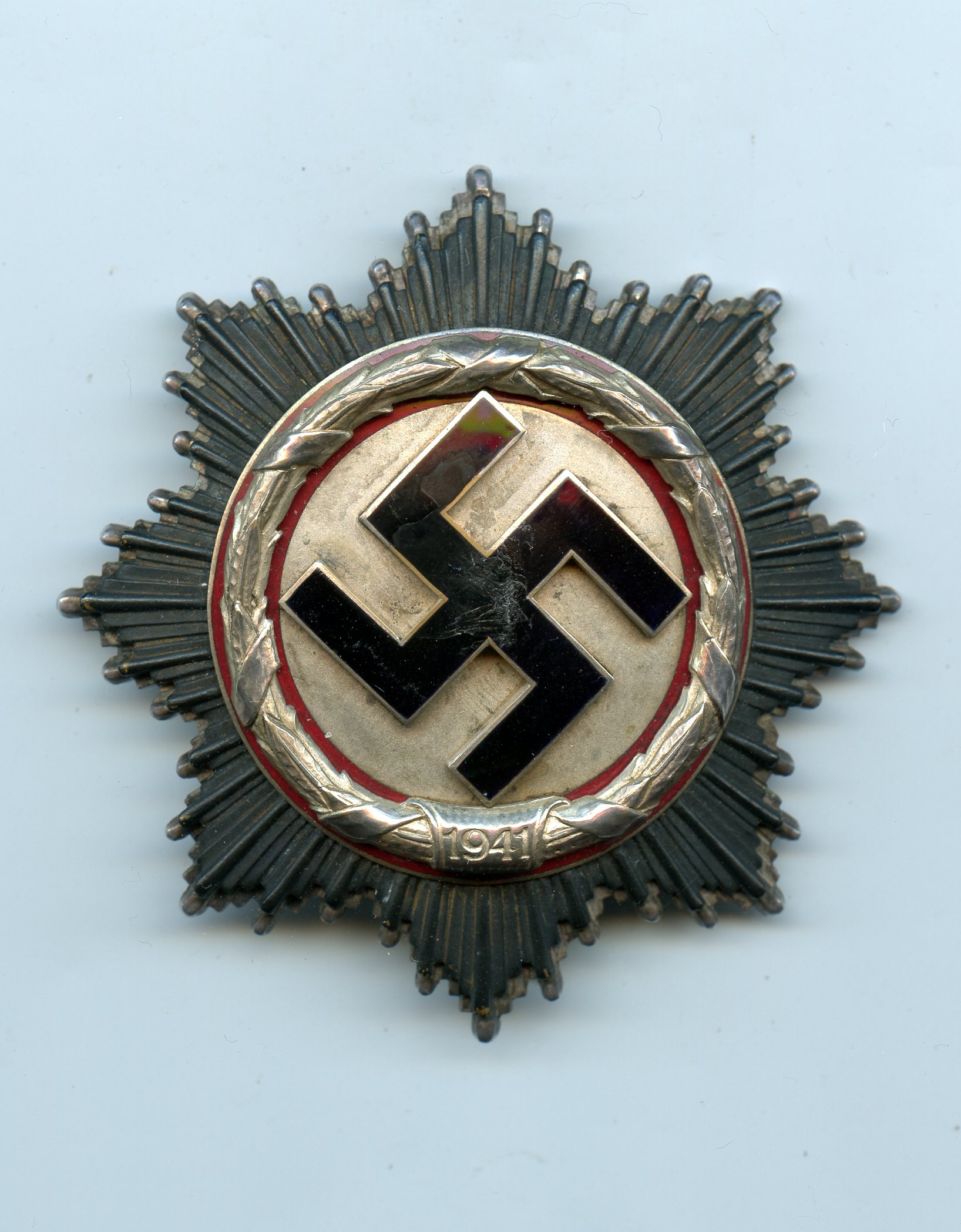 German cross in silver – MM1 Deschler & Söhne, München. Heavy early ‘Deutsches Kreuz in silber’ with tombac back plate and wreath. Remains in lightly worn condition and has some of the top enamel damaged in the center. The outer wreath is still fully finished and silver backing of the swastika is still bright. Very uncommon early DK by Deschler in still good condition.