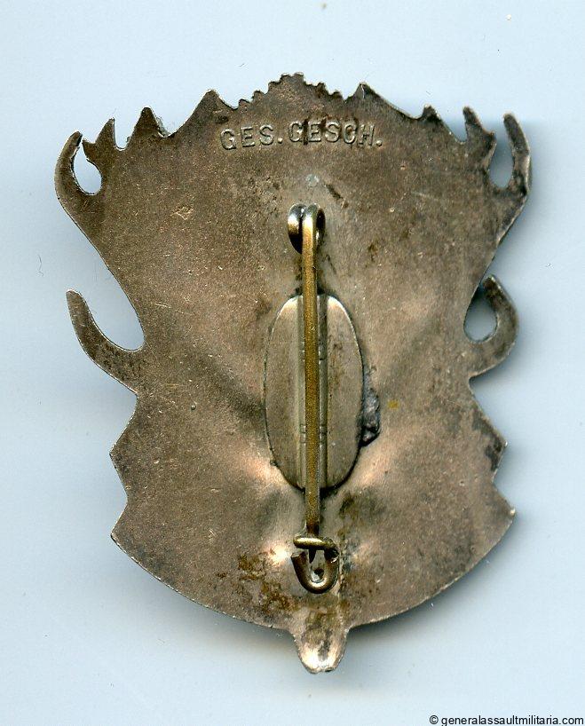 German Hunting Association badge (Deutsche Jägerschaft) – Ges Gesch. Pre war tombac construction badge with silver plated finish and soldered on setup. Remains in lightly worn condition with a typical silver patina. High quality example made with early materials.
