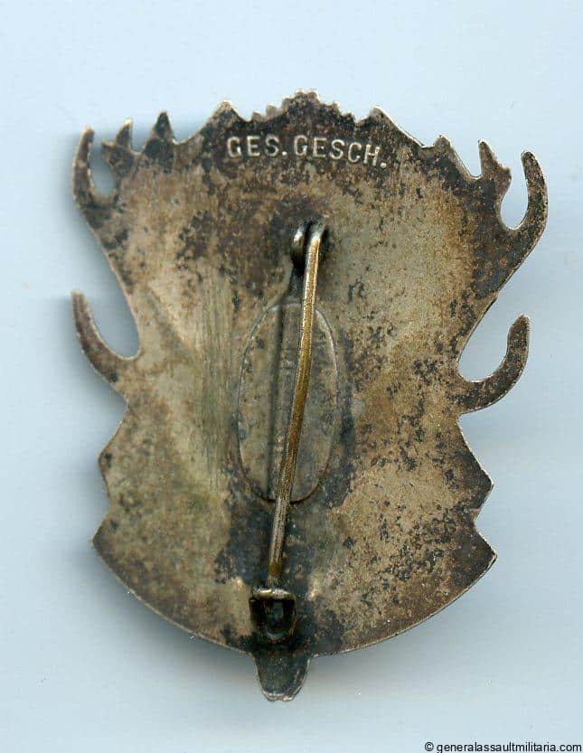 German Hunting Association badge (Deutsche Jägerschaft) – Ges Gesch. Pre war tombac construction badge with silver plated finish and soldered on setup. Remains in lightly worn condition with a typical silver patina. High quality example made with early materials.