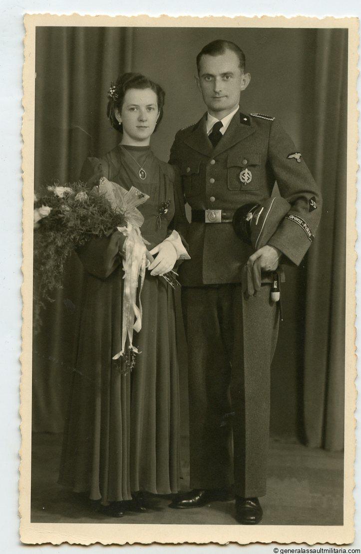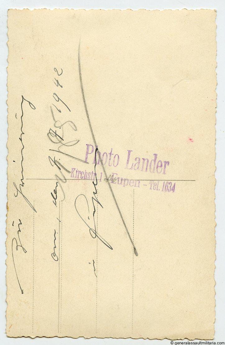 Grenz-Polizei SD portrait. Very interesting and rare full portrait of a member of the Sicherheitsdienst. Shows the SD police uniform in wear with Grenz-Polizei cufftitle, SS Sash hanging from the bayonet, SS cap and SD diamond. Excellent condition, postcard size, Agfa portrait paper, text on the back and with Atelier stamp Photo Lander Eupen. Top portrait!