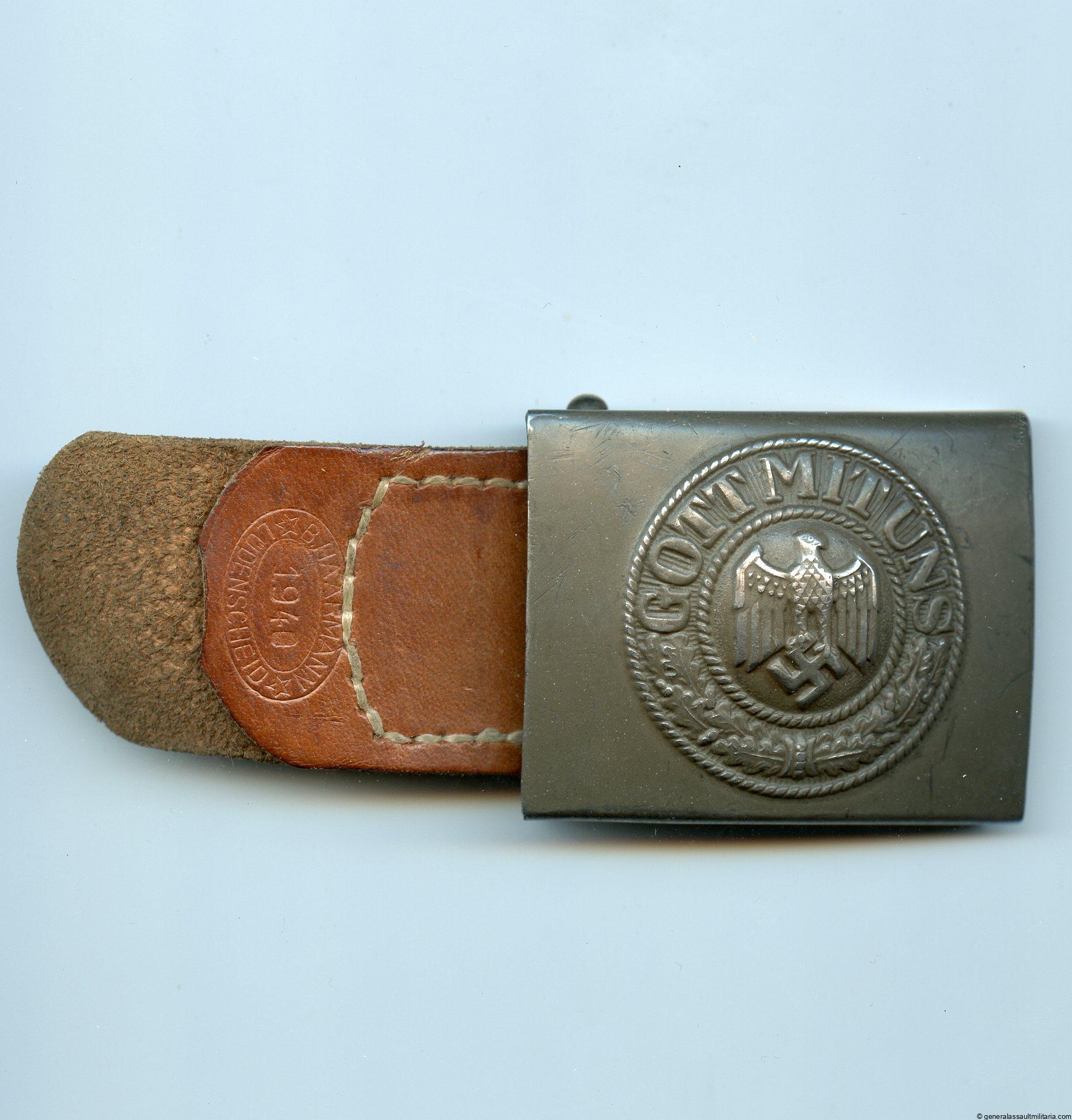 Heer buckle tabbed – B. Haarmann, Lüdenscheid. Early war steel buckle with B. Haarmann, Lüdenscheid 1940 leather tab. Remains in very good lightly worn condition and has nearly all green paint still remaining on the buckle. The leather remains supple and is clearly marked. Good looking buckle that was produced shortly after the aluminum production stopped in 1940.