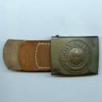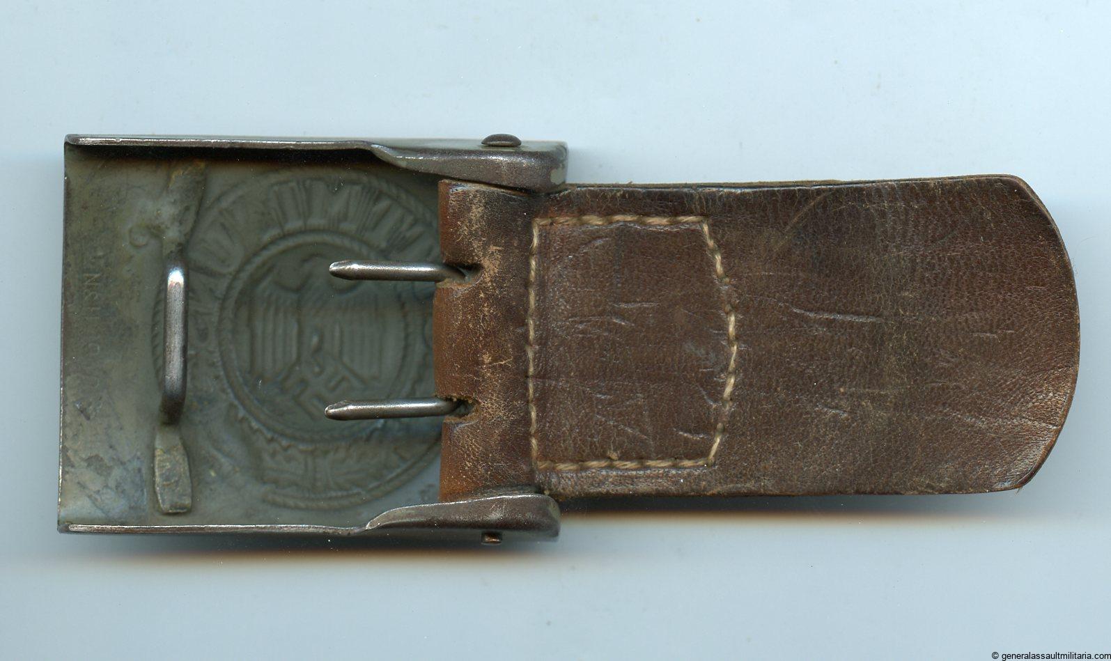 Tabbed Heer buckle – Noelle & Hueck, Lüdenscheid. Early steel production Heer buckle with N&H makers mark both next to the prongs and on the tab. Remains in worn condition with some of the green finish worn down. Produced shortly after the aluminum production stopped in 1940. Tab it self is in very bright and flexible condition.
