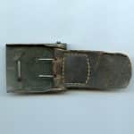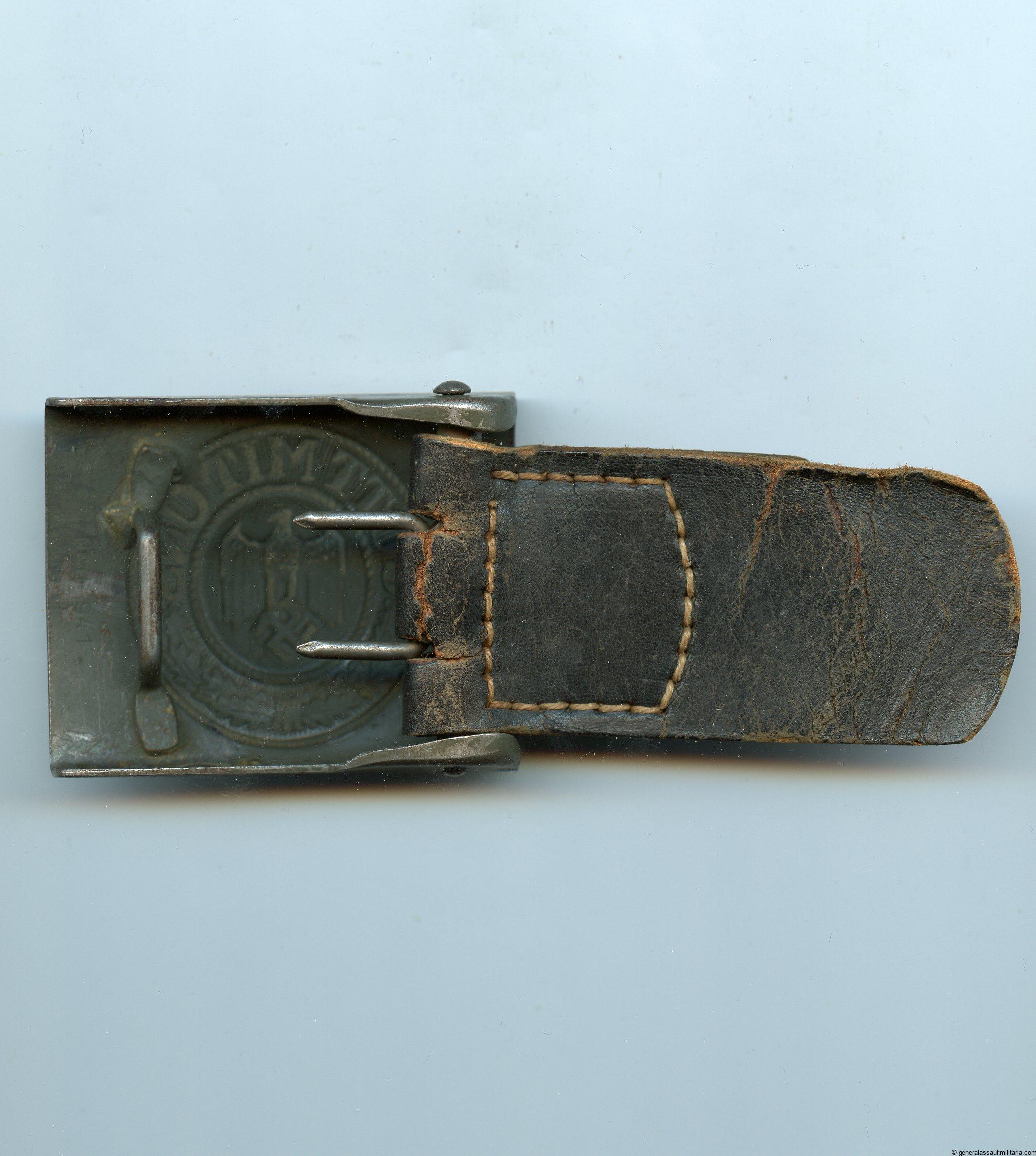 Heer buckle with tab – Noelle & Hueck, Lüdenscheid. 1941 produced steel buckle with N&H 1941 mark on the buckle and the full Hoelle & Heuck stamp on the letter tab. Dark black top and light brown under side. Shows some cracks and a tear near the prongs. Good tabbed buckle with a bit of surface rust on the worn front.