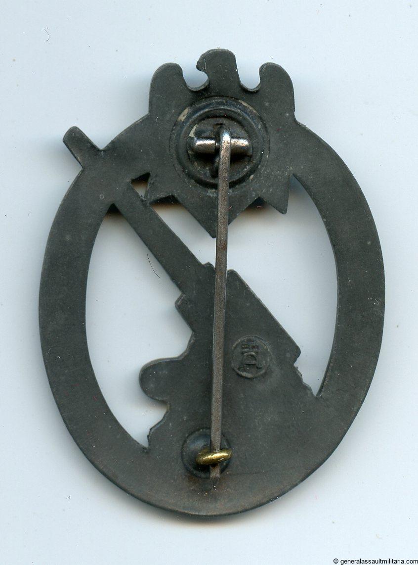 Heer flak badge – Hermann Aurich, dresden. Mid to late war zinc army flak with crimped in setup and HA makers mark on the back. Remains in good condition with dark a appearance and some light wear. Typical Aurich design and one of the few maker marked heer flak out there.