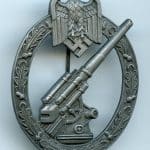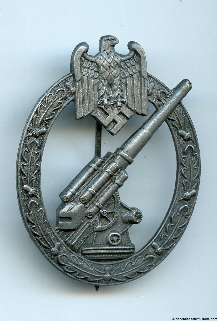 Heer Flak – Gustav Brehmer, Markneukirchen. Mid to late war Heer flak with variant setup and Brehmer design. Remains in unworn condition and shows the silver finish in faded condition. Turned fully grey giving the badge a sharp and well detailed look. Slightly factory vaulted as seen on most Brehmer heer badges. Uncommon Army flak.