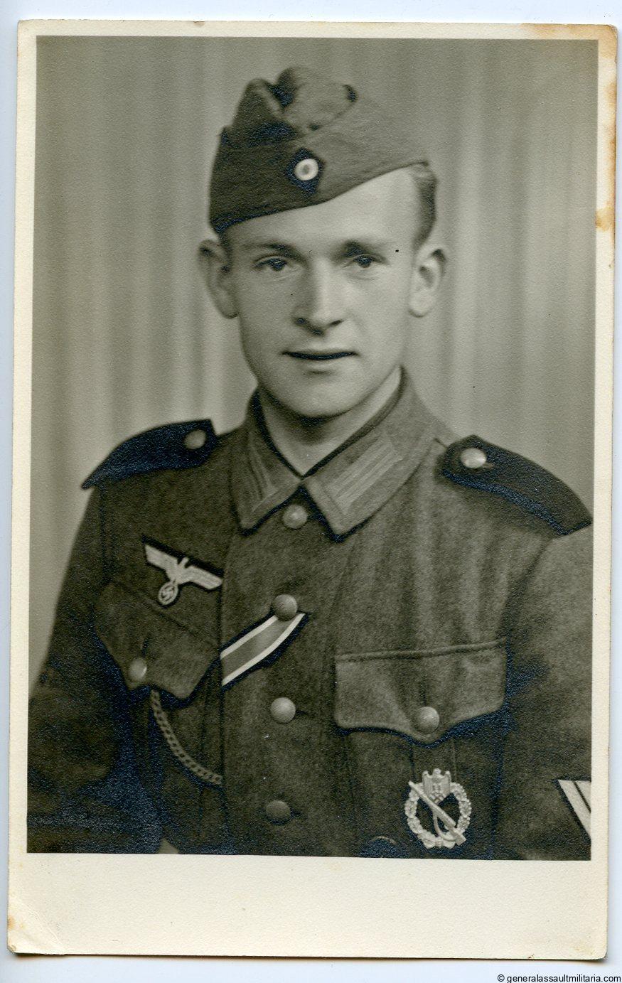 Heer IAB portrait. Postcard size portrait with freshly awarded IAB in silver, wound badge and Ek2 ribbon in wear. Sharp portrait on Agfa portrait paper and atelier stamped on the back. Remains in very good condition with only some light staining to to the top corners edge. Top portrait with what appears to be an F&BL IAB.