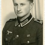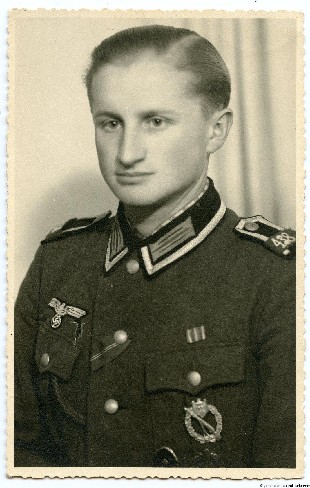 Heer infantry portrait with Ost medal ribbon, west wall ‘Feldspange, IAB, Wb and SA sports badge in wear. Infantry regiment 438 slip ons over the shoulder boards. Remains in good condition with only a small stain below the chest eagle. developed on Voigtländer photo paper and dated Siege, Westmark 1.2.43.