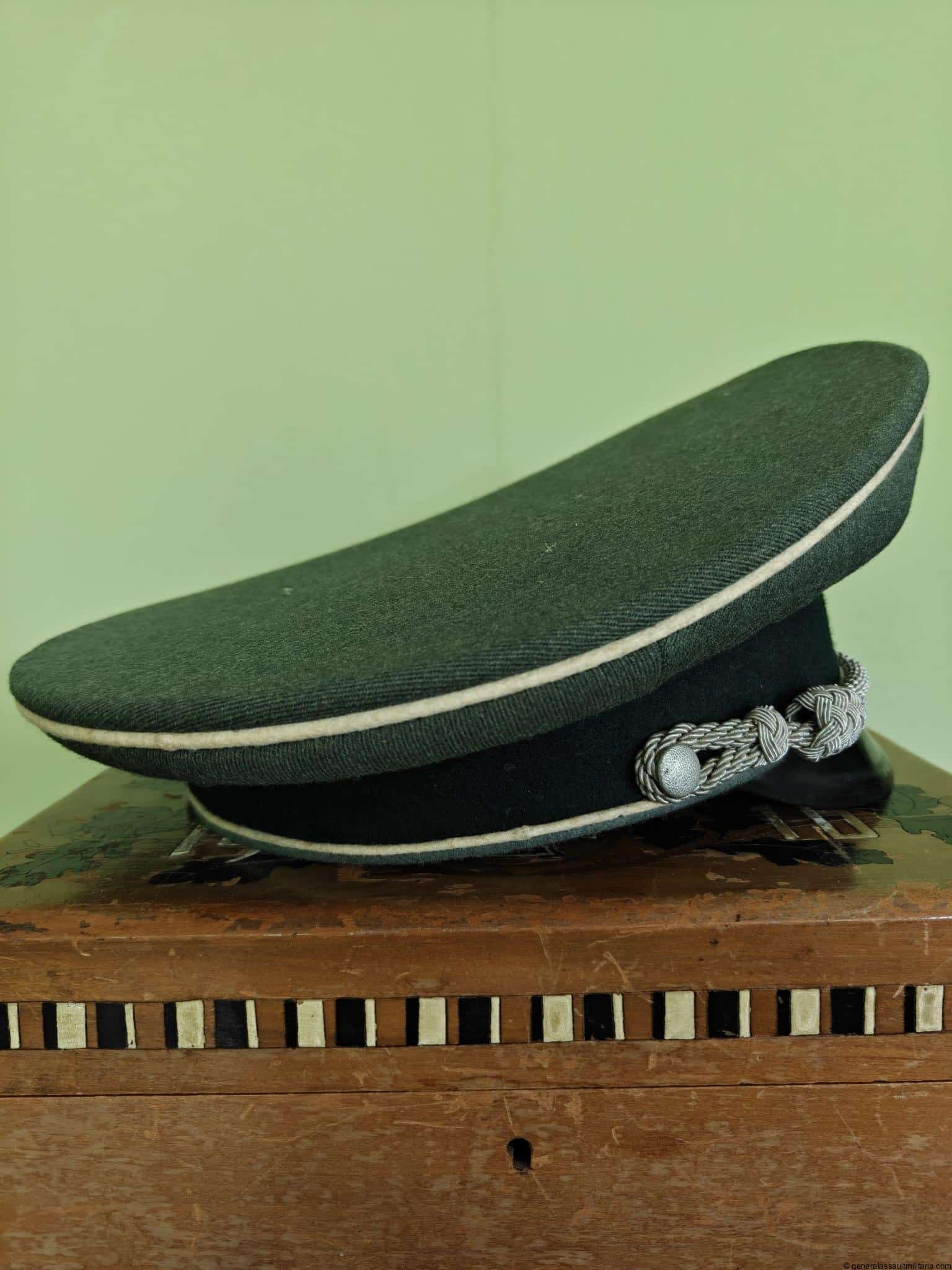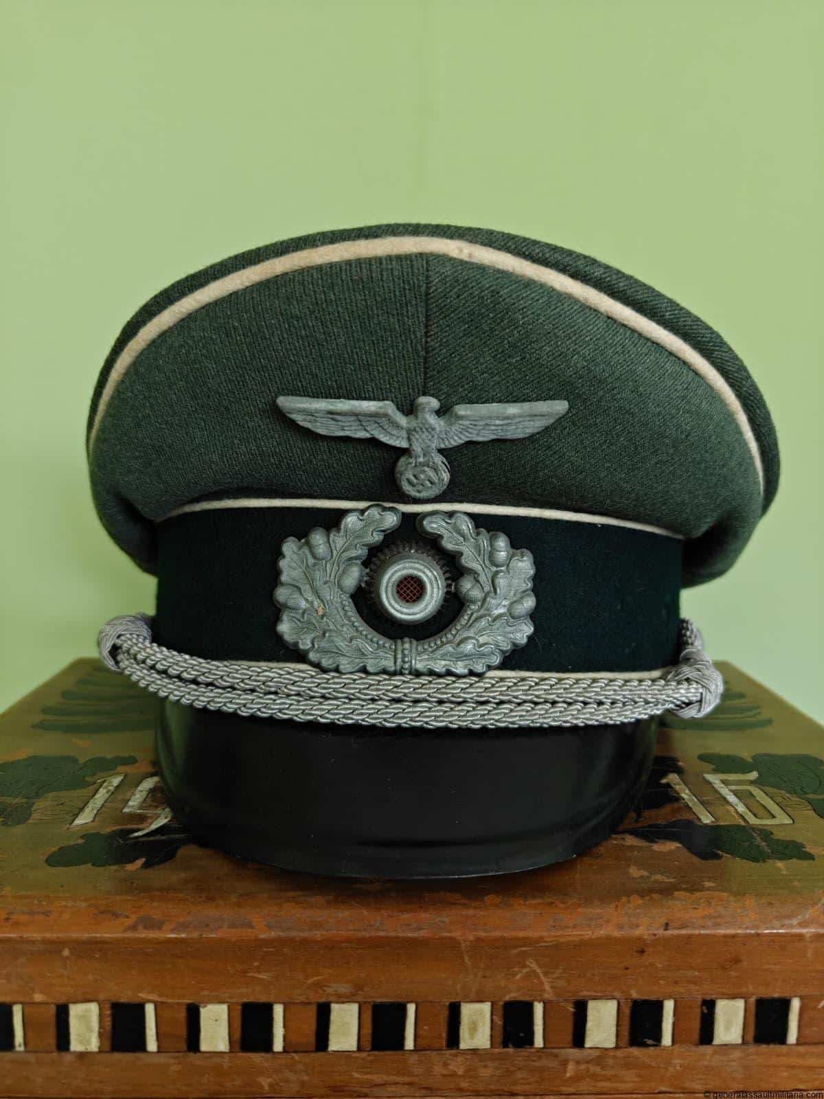 Heer infantry officers visor cap with fresh-air cocade. Cap is in overall good condition with some mothing on the left side. Size 57. This cap was found together with the Heer Infantry officers field blouse ID: 36529