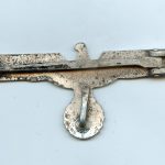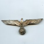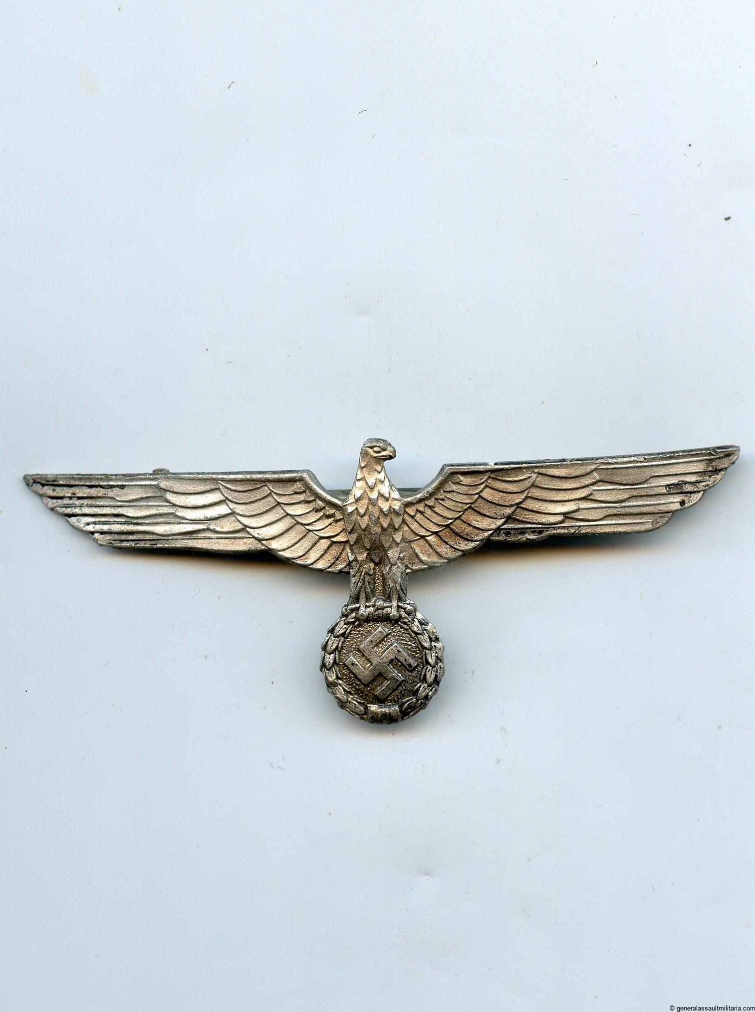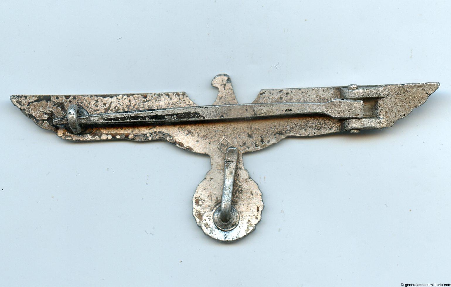 Heer officer summer tunic eagle. Solid aluminum construction with silver finish and crimped/integral aluminum setup. Remains in lightly worn condition and shows a couple specs of finish missing on the front. Some light patina, but still good looking eagle for the white Heer tunic. Maker marked M on the back