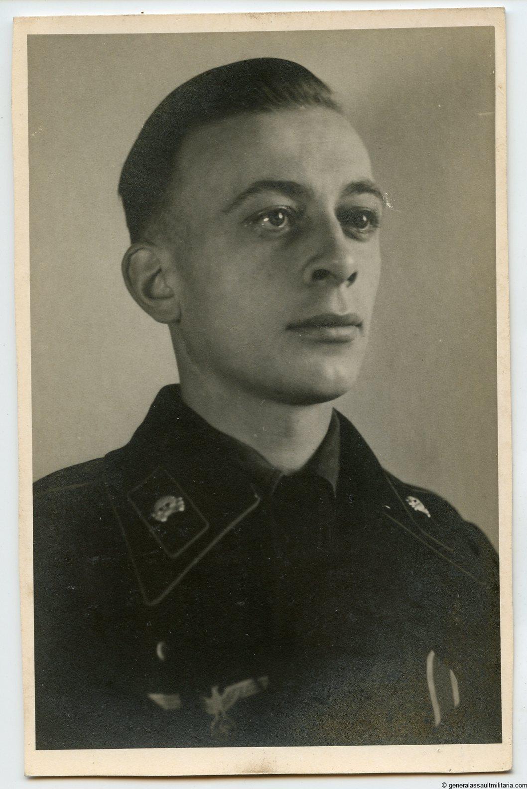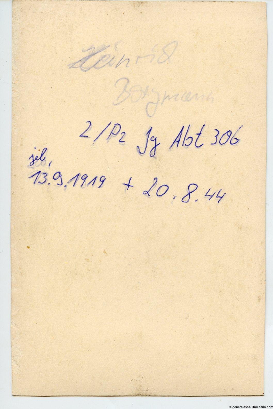 Heer panzerjäger abteilung 306 portrait with early piped black wrapper in wear. Remains in very good condition and only has some vague spots in the corner. Unmarked paper and slightly smaller than post card size. Reverse is marked with 2/Pz Jg abt 306, Heinrich Bergmann. Geb 13.9.1919 and KIA 20.8.44.