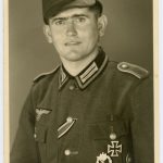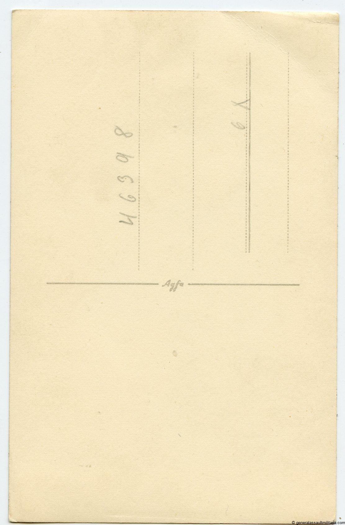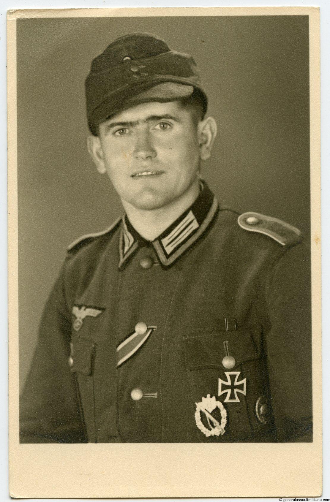 Heer portrait with Ek2 ribbon, Ost medal feldspange, Ek1, Silver IAB and wound badge black in wear. Good quality portrait with sharp details and only very minor signs of wear, slight damage in the top right corner. On period Agfa postcard paper.