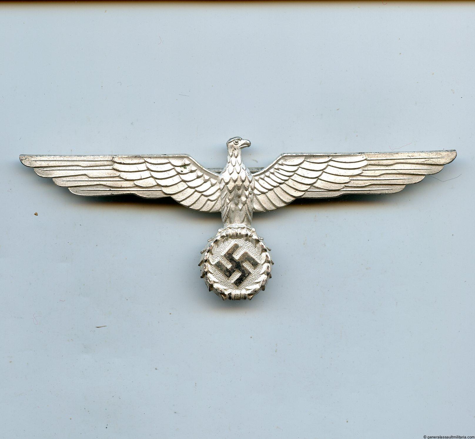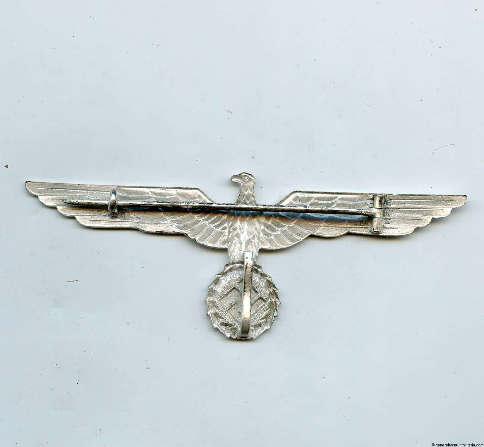 Heer summer eagle – unknown maker. Hollow tombac construction eagle with soldered on setup and prong for wear on the Heer summer uniform. Remains in perfect mint condition with polished swastika and beautiful frosting. Rarely found this nicely preserved.