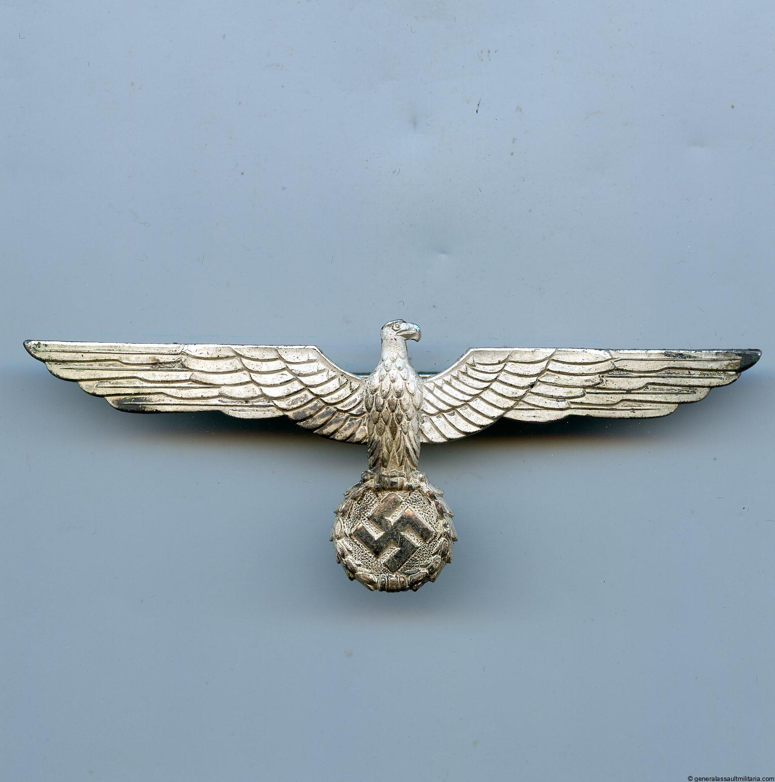 Heer Summer uniform eagle. Early tombac eagle with silver finish and polished highlights. Remains in unworn condition with crimped in catch and shows a slight patina at some areas. Very nicely preserved example for the Heer Summer uniform or as a collectable eagle.