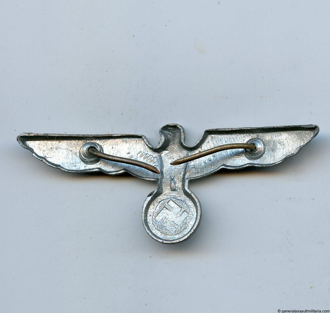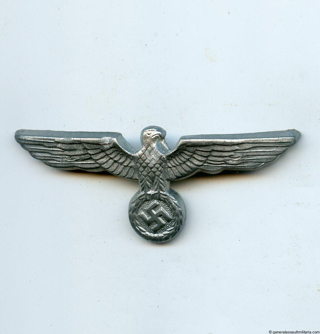 Heer visor cap eagle. Zinc construction with crimped tombac prongs and ‘Glanzverzinkt’ finish. Remains in very good lightly worn condition with nearly all the finish present.