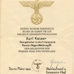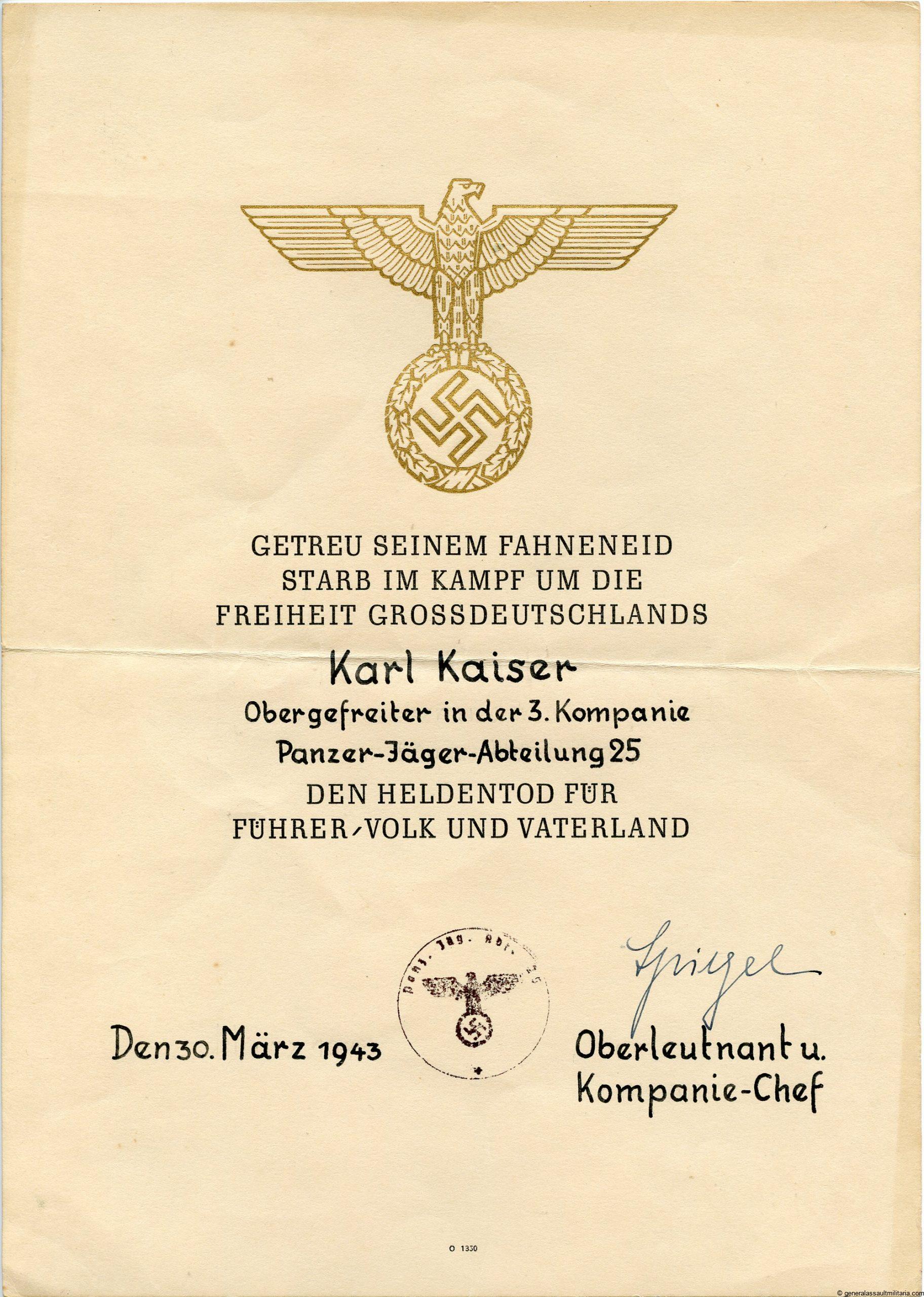 Heldentod(Heroes death) document to Karl Kaiser Obergefreiter in the 3.Kompanie Panzer-Jäger-Abteilung 25. Dated 30th of March 1943 and was signed by the Kompanie commander. Remains in very good condition with only a horizontal vault line over the middle.