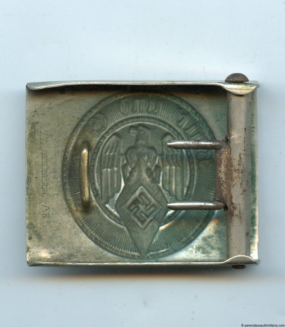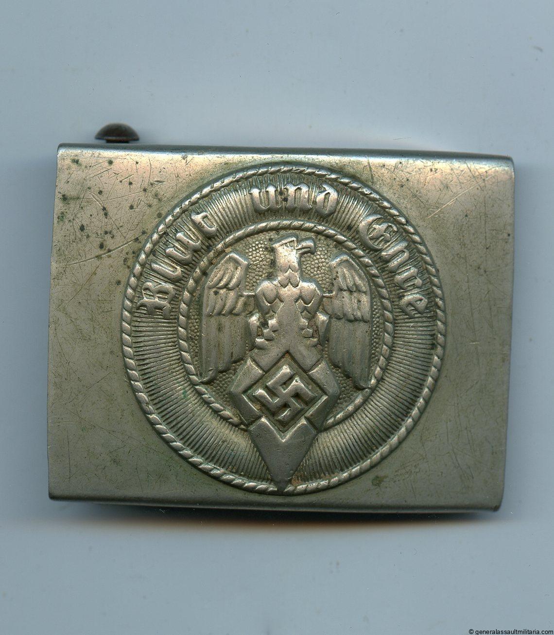 Hitler youth buckle – Assmann & Sohn, Lüdenscheid. Early 30s Nickel silver construction Hitler Jugend buckle with full Assmann mark. Remains in good worn condition with typical nickel silver patina through out. More uncommon untouched early HJ buckle.