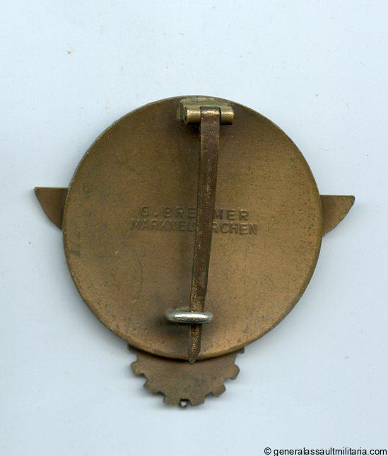 Hitler youth Kreissieger 1938 – Gustav Brehmer, Markneukirchen. Tombac pre war Kreissieger with white enamel inlay backing and enemal diamond. Remains in excellent unworn condition with a dark bronze finish. Maker marked with the full Brehmer mark on the back. Top preserved 1938 Kreissieger. Small scratch on the enamel besides that very well preserved.
