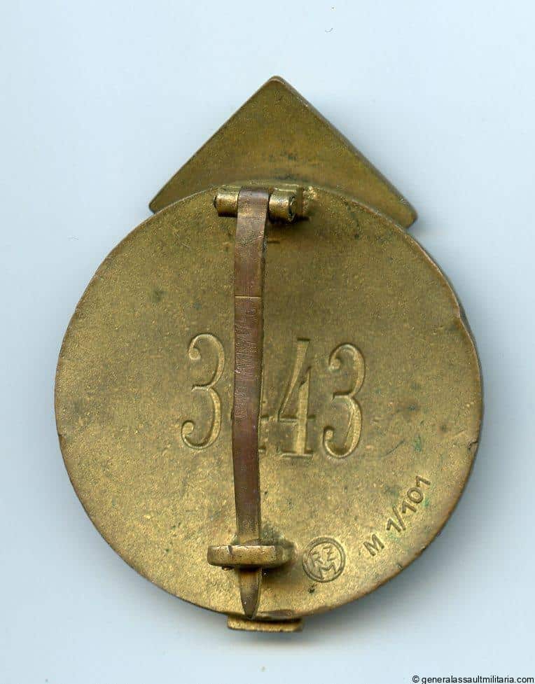 Hitler Youth leaders badge – RZM M1/101 Gustav Brehmer, Markneukrichen. Early tombac construction with enamel inlay, RZM M1/101 mark number #3443. Remains in well worn condition with a good amount of gilding remaining and patina on the worn tombac. Shows some slight damage on the right side to the enamel. Very appealing heavily worn badge that has become difficult to find.