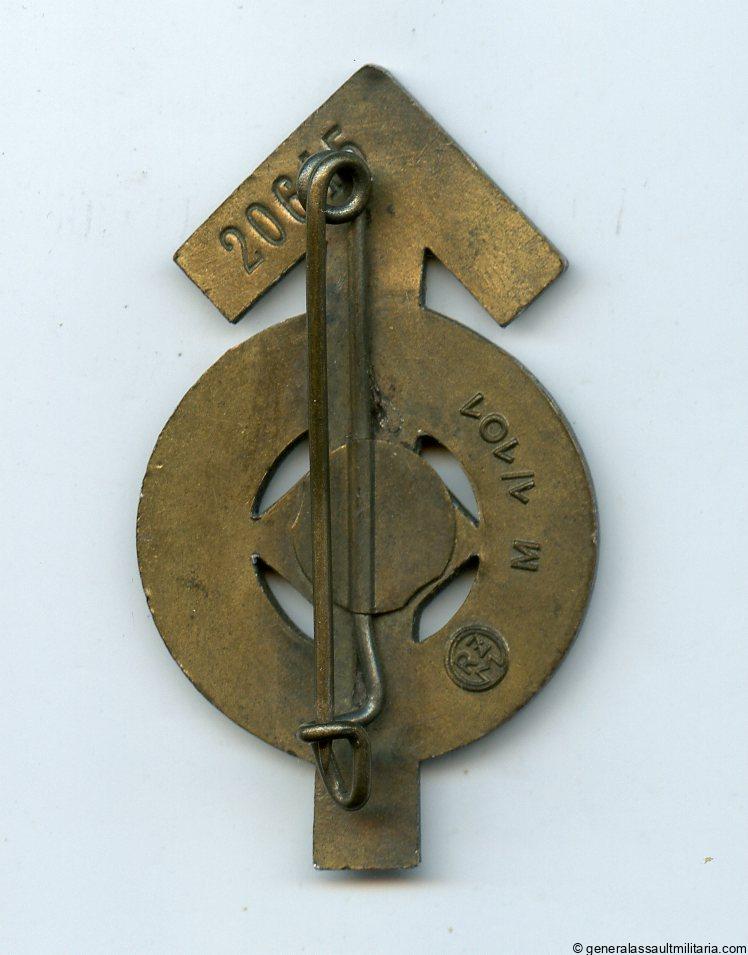 Hitler youth proficiency badge in bronze – Gustav Brehmer, Markneukrichen. Cupal construction HJ Leistungabzeichen with Brehmer RZM M1/101 mark and low number 20645. Remains in unworn mint condition and only has a small factory/production flaw on the swastika. The finish inside the scratch is still there so it must have been present before it went for the finishing processes.