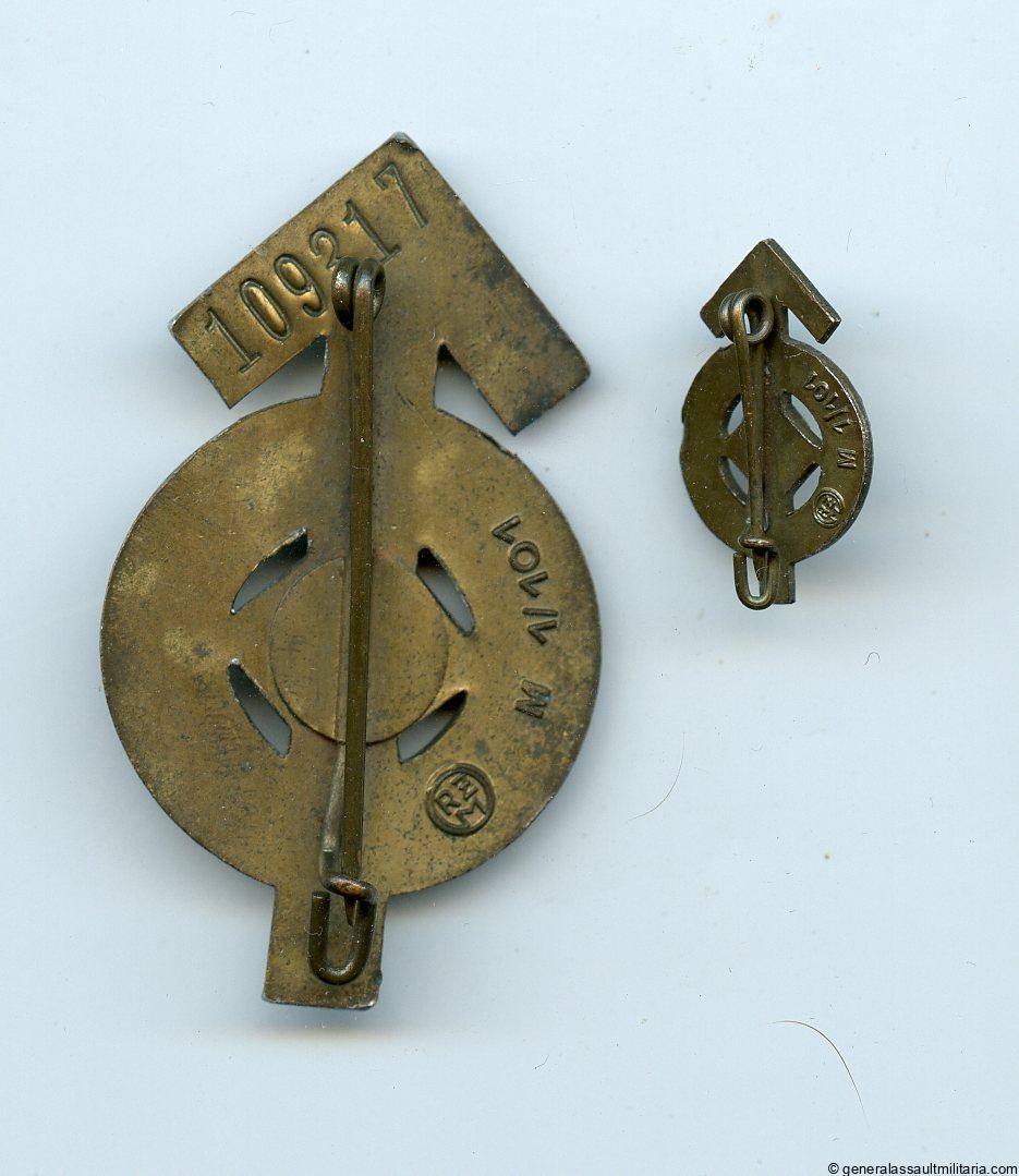 Hitler youth proficiency badge in bronze set – RZM M1/101 Gustav Brehmer, Markneukirchen. Cupal construction with soldered on setup devices and number 209317 on the back. Nicely maker marked with the Brehmer RZM logo. Comes with the miniature bronze variant also made and marked by Brehmer. Remain in good condition with the larger example some wear and age from storage to the front.