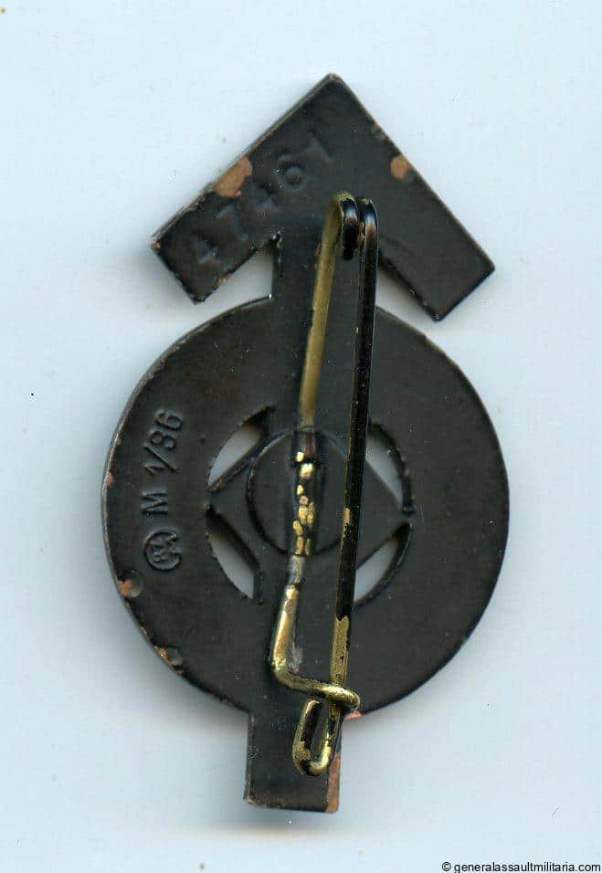 HJ proficiency badge in black – RZM M1/36 Berg & Notle, Lüdenscheid. Early Cupal construction ‘Hitler Jugend Leistungsabzeichen’ with number 47461 and black finish. Remains in worn condition with a part of the fragile black finish worn down on the front. The badge is marked witht he B&NL RZM M1/36 mark on the back. Very appealing worn look to this well preserved example.