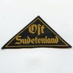 HJ triangle – Ost Sudetenland. Woven HJ triangle in unworn condition with original RZM tag still on the reverse. Yellow example intended for Hitler youth members from Ost Sudetenland.