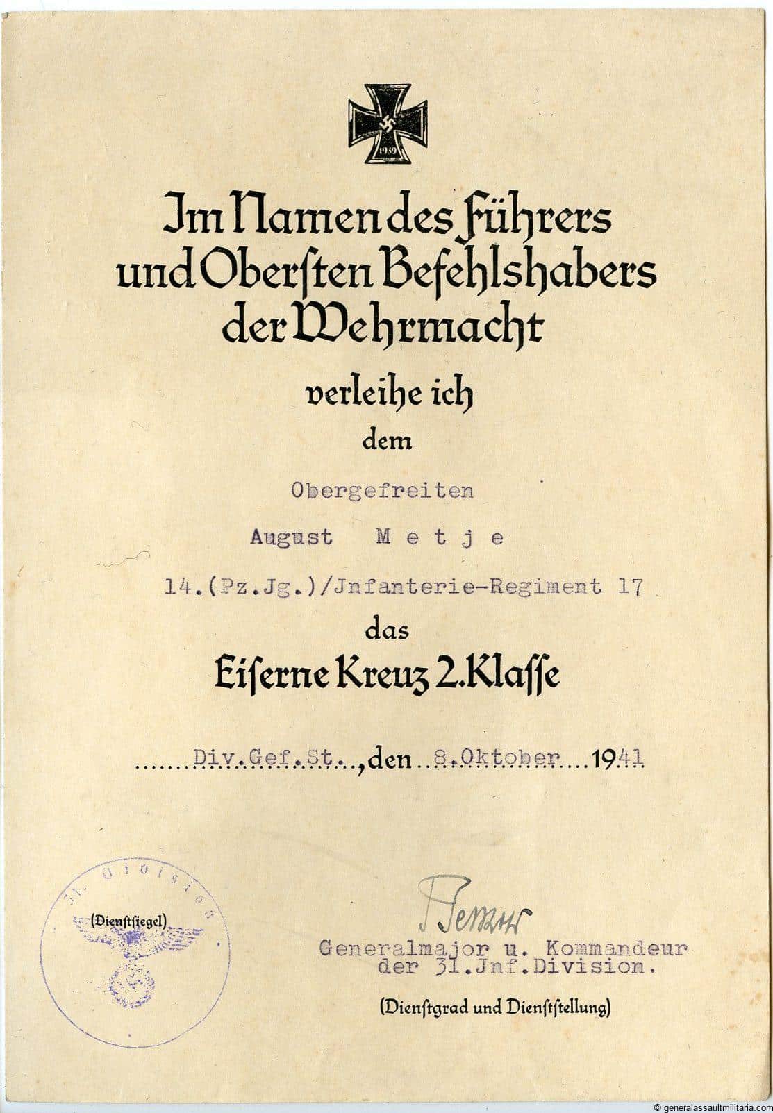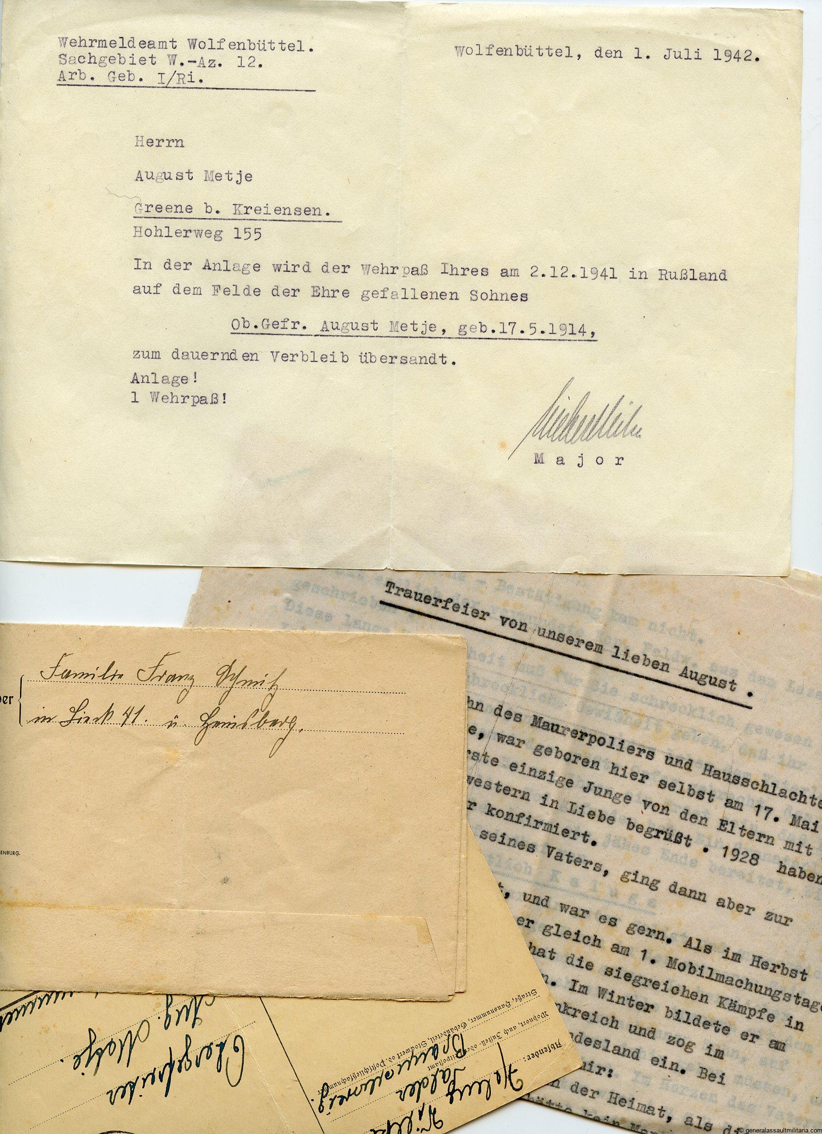 Small KIA document group with Ek2 award document to August Metje 14.(Pz.Jg.)/Infanterie-Regiment 17. Metje was killed on 2.12.41.