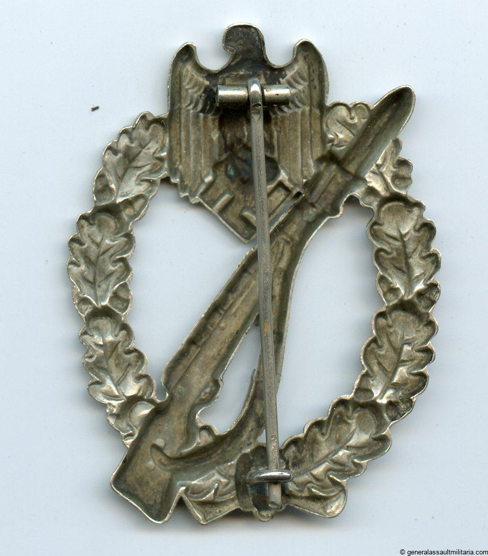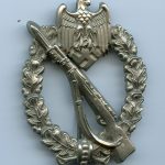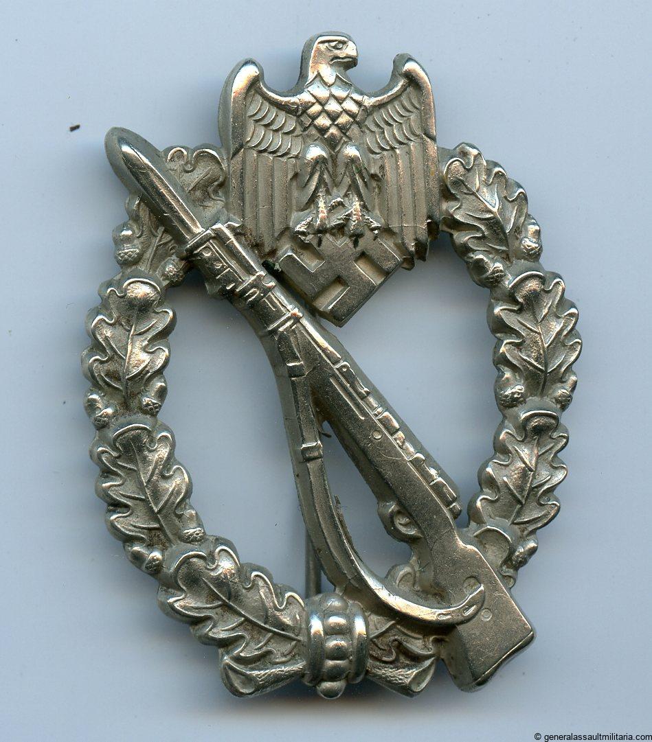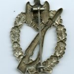 Infantry assault badge – C.E. Juncker, Berlin. early nickel-silver badge with the slightly more uncommon and later second variant hinge. The badge remains in lightly worn condition and shows the nickel-silver material coming through. These Junckers often had a white frosting applied to them. It shows the typical flaw on right wing and remains free of damage or repairs.