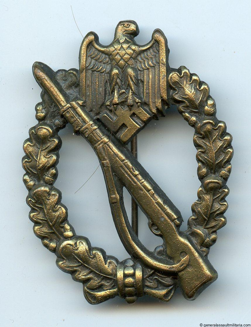 Infantry assault badge in bronze – C.E. Juncker, Berlin. Early war hollow zinc construction ‘Infanterie-Sturmabzeichen’ with Juncker design and two tone bronze finish with tombac coated base. Remains in perfect stone mint condition. Can`t be upgraded, from my personnel collection.