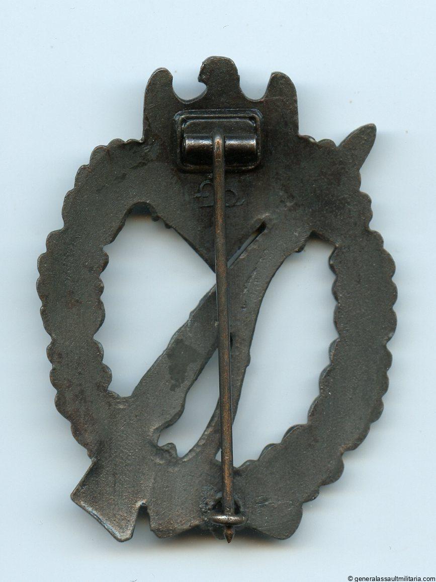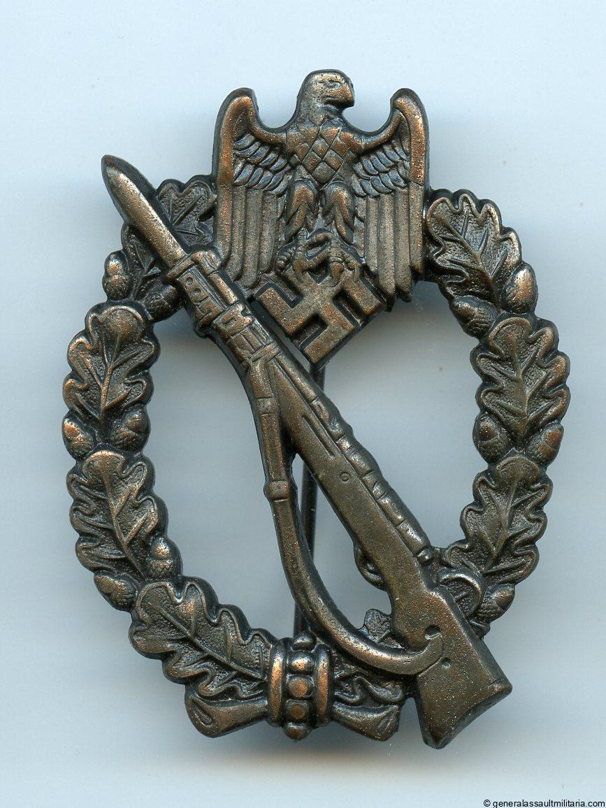 Infantry assault badge in bronze – Friedrich Orth, Wien. Mid to late war heavy solid zinc ‘Infanterie Sturmabzeichen’ with FO makers mark and extremely hard to find bronze finish. Remains in excellent condition with a copper like bronze finish and shows no wear. Retained near perfect finish! Less than a hand full of bronze FO in this condition are known, premium IAB.