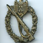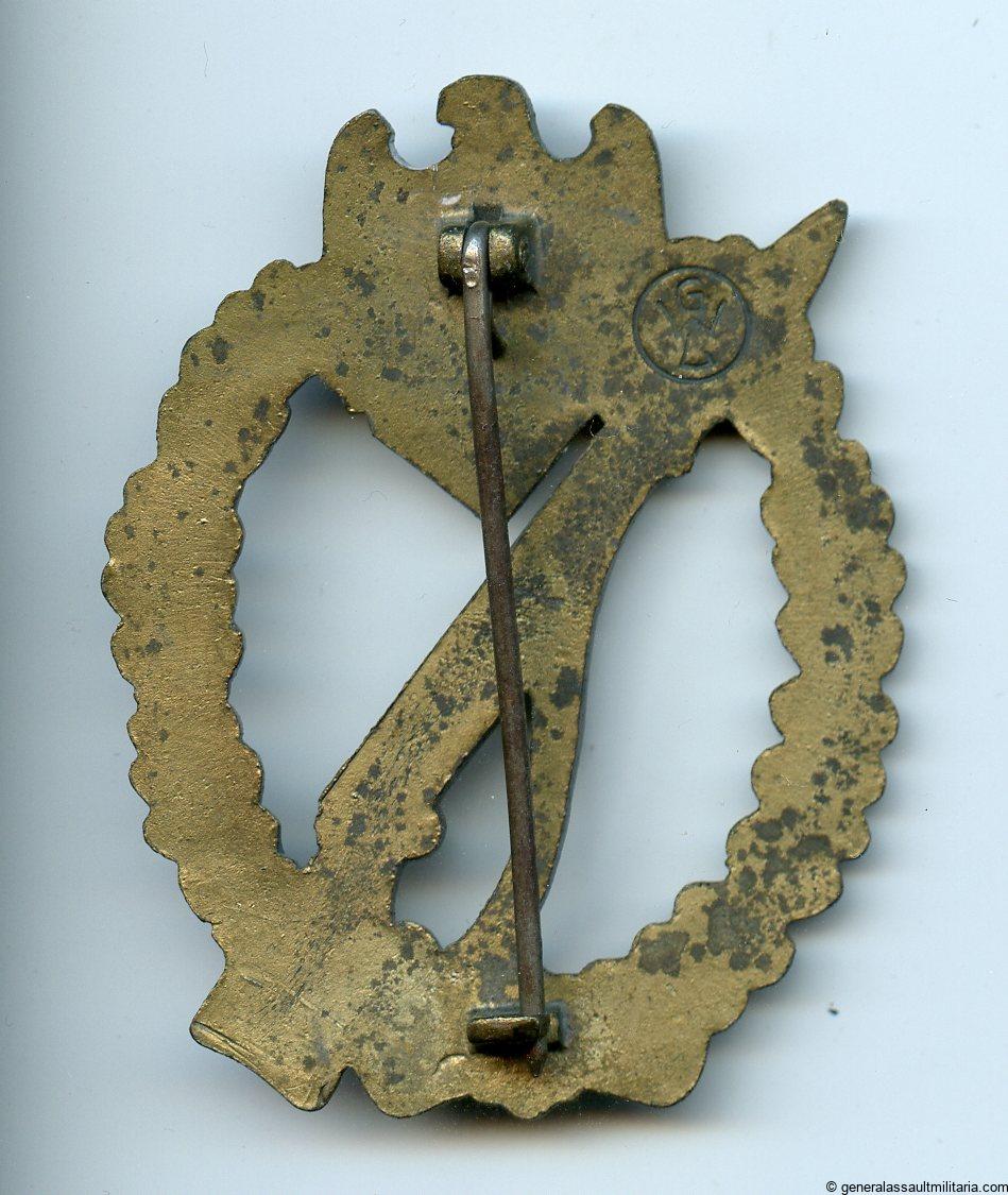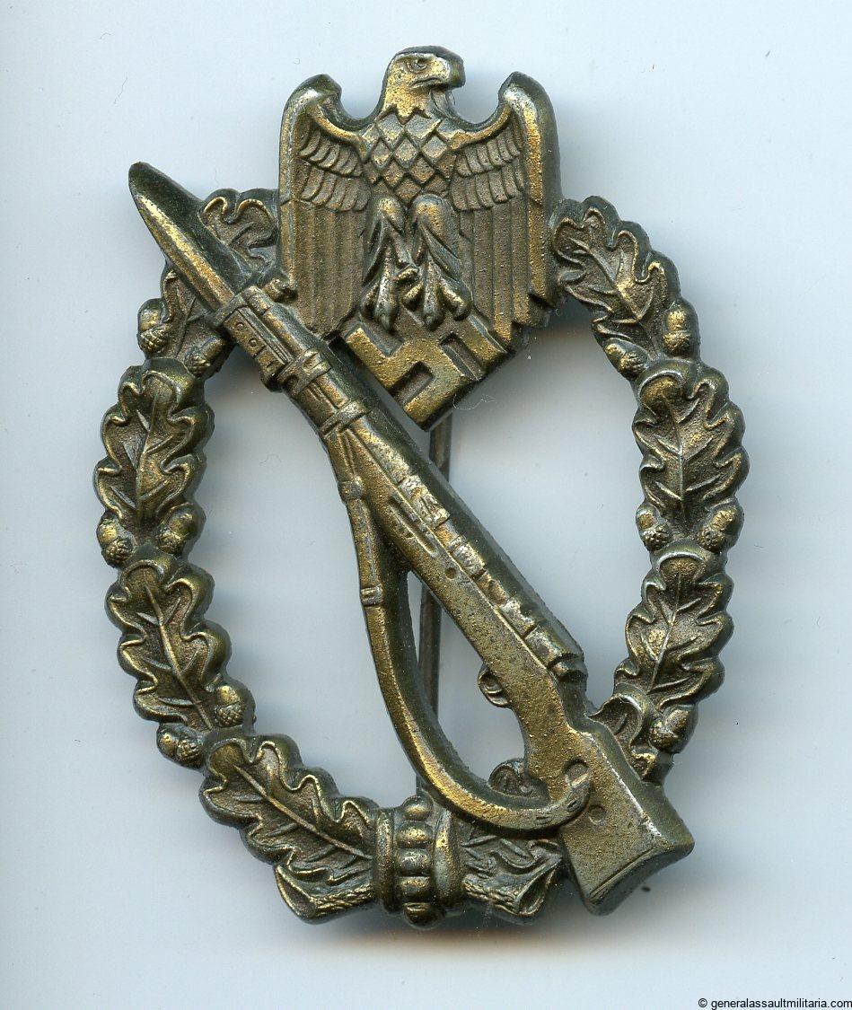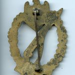 Infantry assault badge in bronze – Gebrüder Wegerhoff, Lüdenscheid. Solid zinc IAB with integral setup and GWL maker mark. Remains in lightly worn condition and has most of the two tone bronze finish still present. More difficult to find IAB in bronze without damage or repairs.